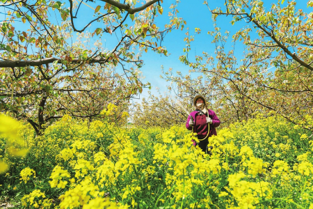 4月8日,运城市盐湖区龙居镇罗义村村民正在喷洒防治虫害的农药。时下,在盐湖区各村,村民们抓住晴好天气,对麦田、蔬菜园、梨园进行打药、除草、修剪等一系列春季管护工作,确保农作物增产增收。