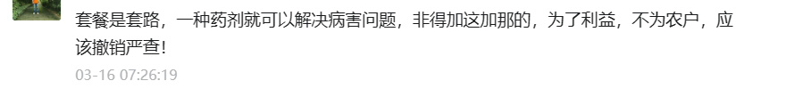 农药“套餐”弊大于利还是利大于弊?应不应该下架?关于这个问题,从去年小编刊发《》后,就不断引发业内人士热议。面对农药“套餐”,各大相关媒体平台留言也出现了两种截然不同的声音。销售连体包装、套餐农药是否合法?