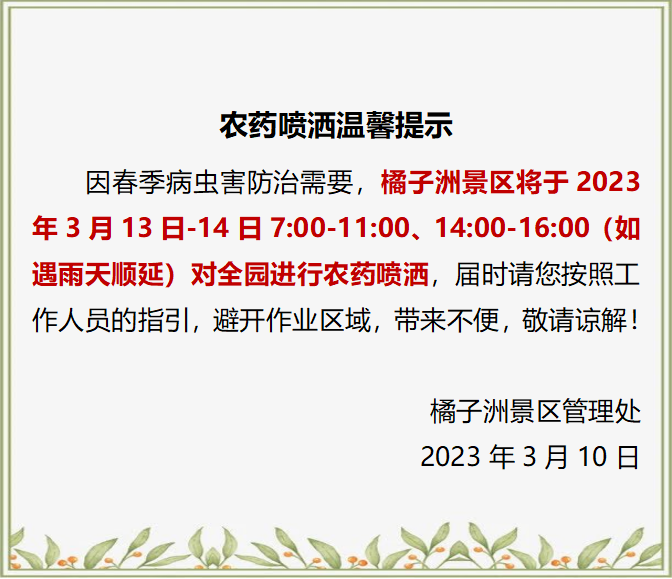 3月10日,记者从长沙橘子洲景区管理处了解到,该景区将于2023年3月13日-14日,7:00-11:00、14:00-16:00,对全园进行农药喷洒。届时请前往橘子洲景区的游客避开作业区域。