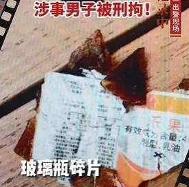 农药瓶着地后玻璃碎片散落,残留农药喷溅至幼儿园供儿童游乐的攀爬设施上。