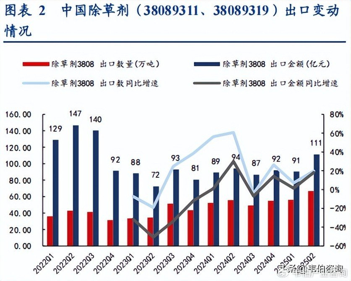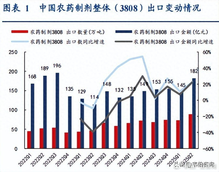 2025Q2,农药制剂出口金额大幅提升至182亿元,基本接近2022年的景气水平,行业需求侧显著修复。