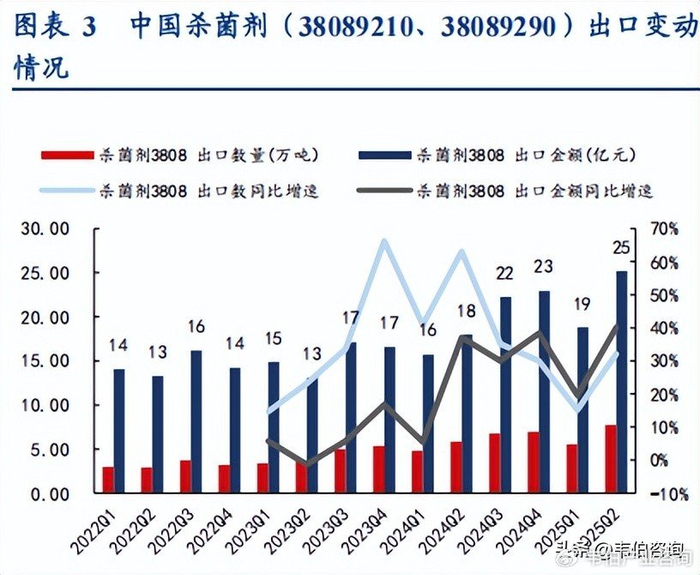 2024年四季度杀虫剂出口金额已达39.74亿元,同比增长14.2%。2025年二季度3808项下杀虫剂制剂出口金额达45亿元,相比2022年Q2增长了59%。