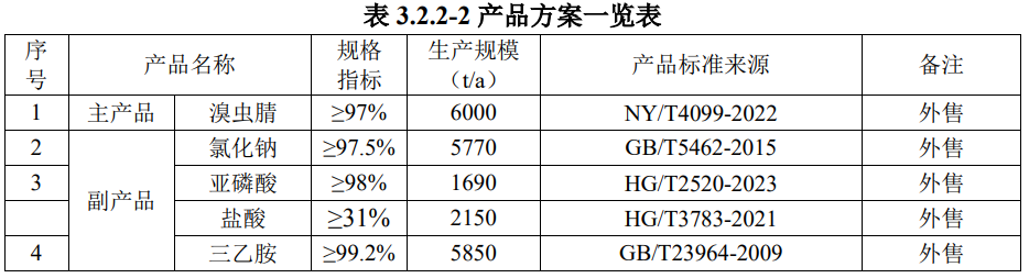 本次建设内容及规模:建设年产6000吨溴虫腈,年产5770吨氯化钠,1690吨亚磷酸,5850吨三乙胺,2150吨盐酸,生产车间、仓库、罐区及相关配套设施。