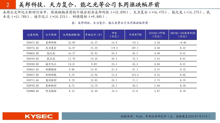 本周开源北交所化工新材二级行业整体表现较好,纺织制造、金属新材料、专业技术服务业、化学制品、非金属材料、橡胶和塑料制品业实现上涨,周涨跌幅分别为:+9.03%、+8.86%、+7.06%、+5.91%、+4.52%、+3.30%;仅电池材料行业出现下跌,周涨跌幅为-1.17%。周涨跌幅居前的个股分别为美邦科技(+32.89%)、天力复合(+16.47%)、能之光(+16.27%)、民士达(+15.78%)、迪尔化工(+10.21%)、科强股份(+9.88%)。
