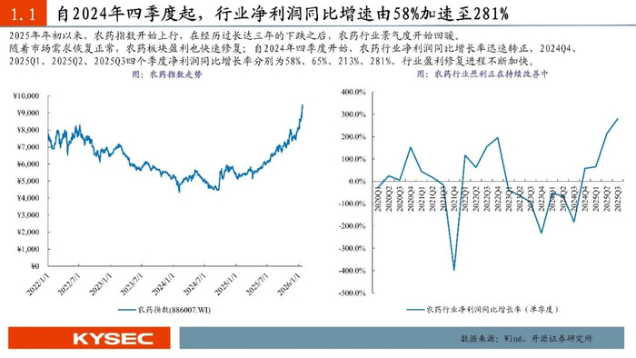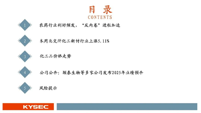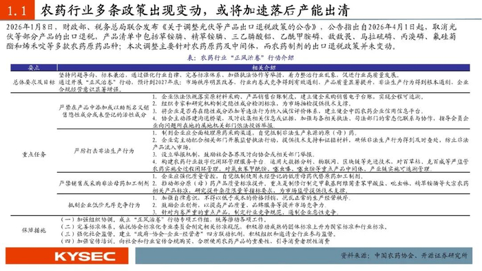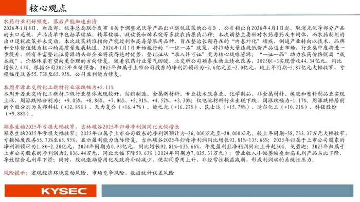 2026年1月8日,财政部、税务总局联合发布《关于调整光伏等产品出口退税政策的公告》,公告指出自2026年4月1日起,取消光伏等部分产品的出口退税,产品清单中包括草铵膦、精草铵膦、敌敌畏和烯禾啶等多款农药原药品种;本次调整主要针对农药原药及中间体,而农药制剂的出口退税政策并未变动。本次政策精准指向产能过剩和高毒禁限用品种,旨在整治长期存在的“内卷外化”顽疾,倒逼产业转向以技术、品牌和全球价值链为核心的高质量发展轨道。2026年1月1日开始施行的“一证一品”政策,将推动大量违规低价产品退出市场,行业集中度将进一步提升,拥有丰富登记证资源的头部企业将获得绝对优势,登记证从“准入许可证”变为核心战略资源;“一证一品”助力农药价格脱离“成本线”,价格体系有望向更合理的方向修复。随着农药行业景气回暖,北交所公司颖泰生物业绩也改善,2025Q1-3实现营收44.34亿元,同比增长2.47%。根据公司2025年业绩预告,2025年归属于上市公司股东的净利润预计为-2.6亿元至-2.0亿元,较上年同期-5.87亿元大幅收窄,亏损幅度改善55.73%至65.95%,公司盈利能力修复。