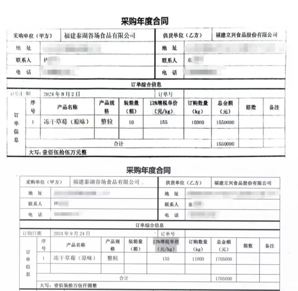 8月2日,双方签订《采购年度合同》,订购“冻干草莓”10000kg,总金额155万元。9月24日,双方签订第二份《采购年度合同》,订购“冻干草莓”11000kg,总金额170.5万元。订单均约定,供应方所提供的货物及包装,要符合国家关于食品卫生、食品添加剂标准及食品安全法律规定及行业标准。