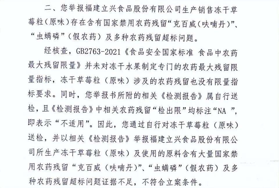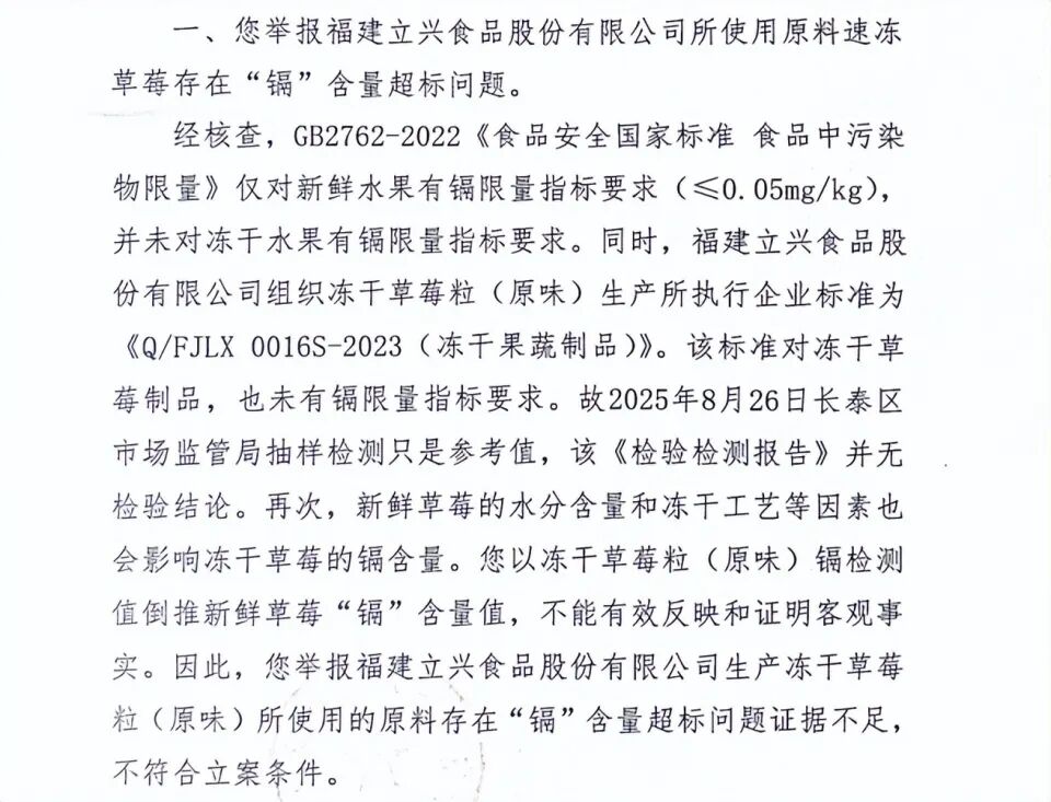 2026年1月15日,华安县市监局出具《不予立案告知书》显示,冻干草莓镉含量超标问题。经核查,GB2762-2022《食品安全国家标准 食品中污染物限量》中仅对新鲜水果有镉限量指标要求,并未对冻干水果有镉限量指标要求。立兴食品公司所执行的为企业标准,该标准对冻干草莓制品,也未有镉限量指标要求。新鲜草莓的水分含量和冻干工艺等因素也会影响冻干草莓的镉含量,故以冻干草莓粒镉检测值倒推新鲜草莓的镉含量,不能有效反映和证明客观事实。故投诉问题证据不足,不符合立案条件。