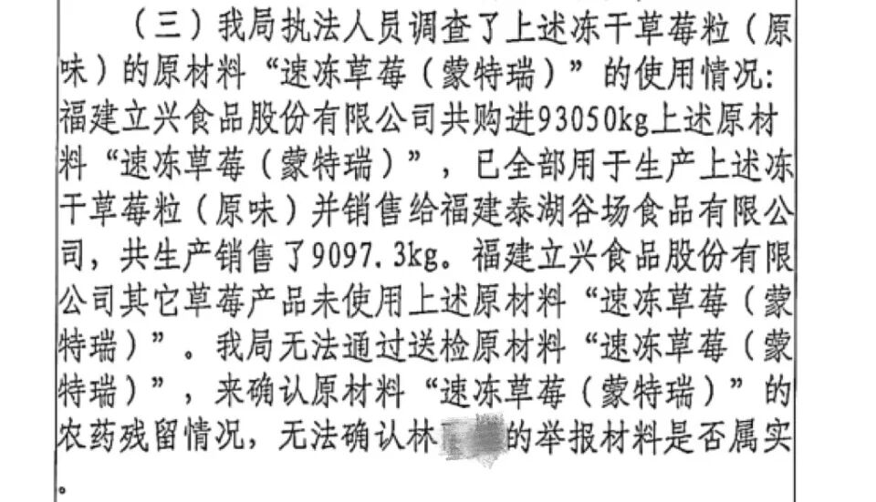 此外,立兴食品公司共购入了93吨多的原材料“速冻草莓(蒙特瑞)”,已全部用于生产上述冻干草莓粒,并销售给泰湖谷场食品公司,其他公司未使用。